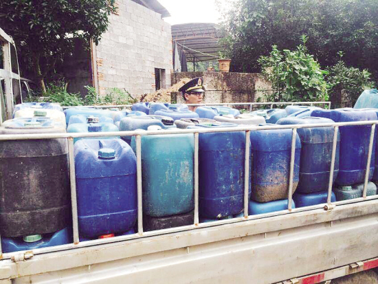当执法人员赶到现场时,一辆牌照为浙GLZ336的银色小货车正停在居民楼旁边的空地上,车上还插着车钥匙,而车主却已经不见。一股强烈的刺激味扑鼻而来,只见几个空双氧水桶翻倒在地,车上则是满满的蓝色双氧水桶。一看,双氧水已经开始泄漏,一滴滴的透明液体正顺着车沿往地面滴,并冒起了一堆白色泡沫。执法人员表示,幸好这些双氧水是漏在石子路面上,要是漏在草堆、垃圾堆等地方,阳光一照极易起火。据现场村民介绍,这辆车以前也见过,双氧水一般都卖给村里的工厂做漂白之用。