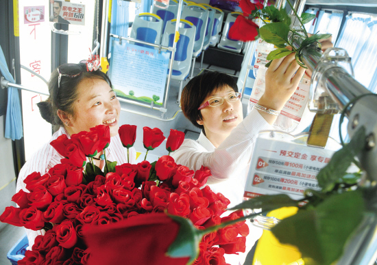 今天是七夕。昨天,金华市公交集团营运二公司工作人员将8路公交车改装成爱情巴士,玫瑰花缠绕扶手,玩偶悬挂其中,车窗两侧贴着鹊桥相会、月老牵线等传统剪纸,在椅背上还贴有关于传统爱情的诗句。