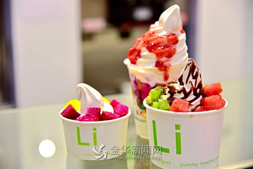 除了每天从杭州来的新鲜酸奶,制作冻酸奶的关键是冰激淋机。而店内从美国空运而来的这两台冰激淋机,王立印就花了40万元。“至少在国内是最好的冰激淋机,比许多连锁餐饮巨头的冰淇淋机打出来的固体会厚实不少。”为了满足市民们不同的口味偏好,冻酸奶还会搭配水果和干果配料。