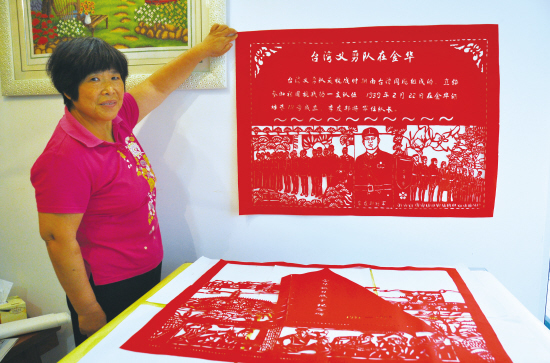 “位于酒坊巷的台湾义勇队纪念馆,是第一批80处国家级抗战纪念设施、遗址之一,我想通过剪纸来纪念抗战胜利70周年,我的作品将在9月3日抗战胜利纪念日在北京展出……”昨天,家住市区杨思岭的71岁老人赵爱凤,将自己的剪纸作品《台湾义勇队在金华》寄往北京参展。作品有人物有文字,除了李友邦及台湾义勇队群像,还有台湾少年团剪影,场面大气明快,又见细部人物表情。