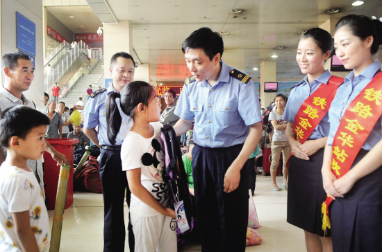 昨天,上海铁路局金华车务段工作人员在铁路金华站候车室,将一批书包及文具送到返乡准备开学的“小候鸟” 手中,叮嘱孩子一定要好好学习,不辜负父母在异地努力工作的辛劳。暑期临近结束,很多返乡的“小候鸟”在家人陪同下排队进站,各车站迎来暑运的又一个客流高峰。