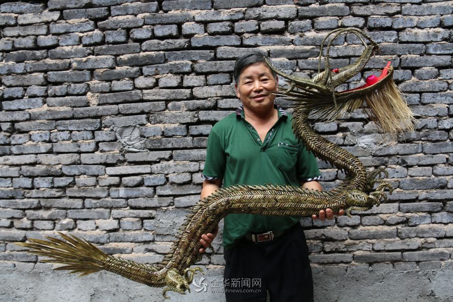 如今,吕金六顶着“草编达人”名头在民间小有名气,是市非物质文化遗产“草编”代表性传承人。其作品《苍鹰捕蛇》、《霸王恐龙》、《中国龙》等先后荣获金华市工艺美术精品展金奖、铜奖。