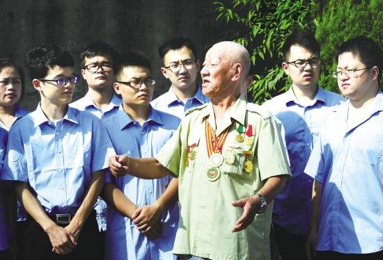 8月25日,国家电网武义供电公司青年职工来到县城侵华日军留下的半截大烟囱遗址旁,听抗战老战士杨立和讲述当年侵华日军掠夺萤石资源的血泪史。