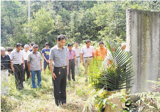 25日上午,横店镇《夕阳无限》编委会组织20多人,来到横店、马宅两镇交界处的木衢岭。他们或手拿柴刀,或捧着花篮,神情肃穆,来这里寻访抗战纪念碑,开展纪念抗战胜利70周年活动。