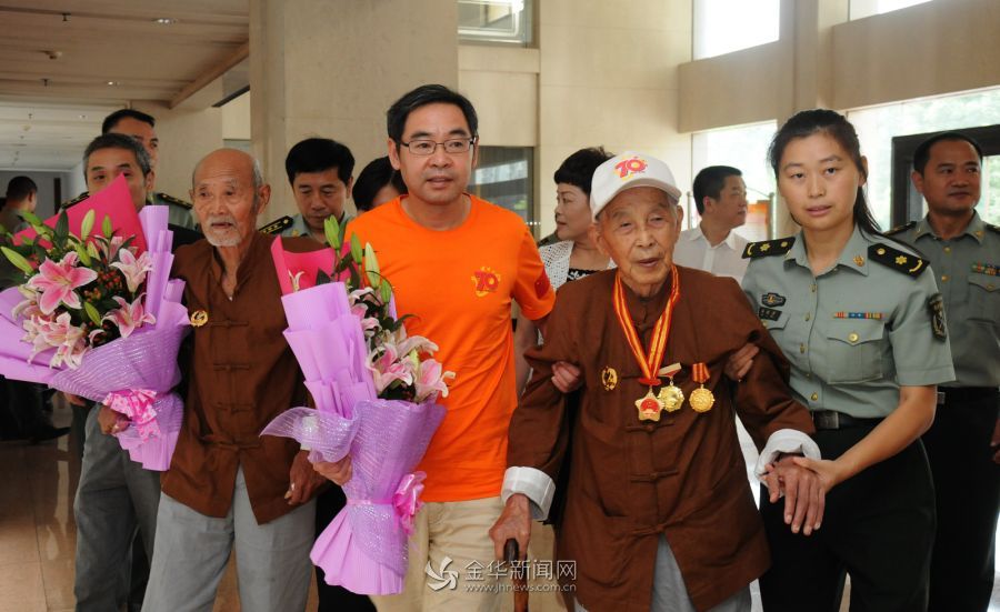 9月5日,金华市赴北京参加纪念抗战胜利70周年阅兵仪式的两名支前模范,永康市的王云锁、武义县的叶三虎回金,受到了金华军分区官兵们的热烈欢迎,给两位老人献上了鲜花。市委常委、金华军分区司令员程友敏、政委杨德山与两位支前模范座谈。今年96岁的永康花街镇王样村老支前模范王云锁,阅兵当天坐在支前模范1号车, 90岁的武义县履坦镇中央王村叶三虎坐5号车,两位老人说:当他们车队经过天安门时看到了党和国家领导人,还看到了阅兵方队的强大阵容,心情非常激动,阅兵结束后,回到所在宾馆精神状态非常好。