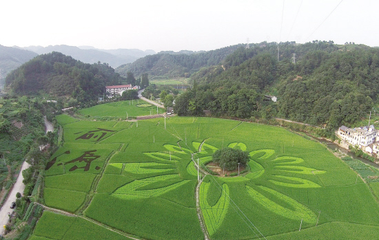 9月7日,空中俯瞰武义县俞源村口以彩色水稻绘制的巨型葵花,图案清晰、栩栩如生,为古村落又增添了一道亮丽风景。武义俞源太极星象村是国家历史文化名村,常年游客不断。为了让古村落更吸人眼球,今年在发展创意农业中,该村对村口百亩太极田精心规划,以种植的紫色、青色、绿色水稻绘成巨型葵花图案,让游客大饱眼福、游兴倍增。