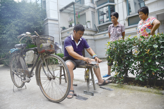 昨天,在金东区东方明珠花园,一名师傅在为居民磨刀。师傅说,去年收取的磨刀普通加工费为5元,今年开始收取8元。如需深加工的话,再加点功夫钱。该师傅姓梁,来自安徽,暂住金华。