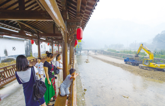 昨日,在婺城区塔石乡塘头村的厚大溪中,几台施工机械在清淤。在村口的风雨长廊边,施工队正进行排污管道施工。