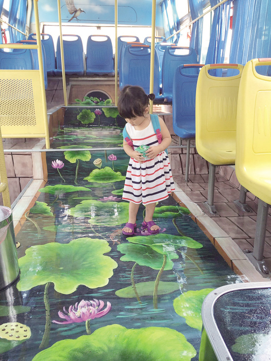 笔者走进主题为“荷塘美景”的公交车,只见地面上绘满了绿色的荷叶、粉红的荷花,荷塘里还有鲤鱼游动,车顶则刷成了天蓝色,上面有白鸽飞翔,恍如走进了一座小型的主题公园。主题为“葡萄架下”的公交车,车顶是葡萄架,挂满了一串串红得发紫的葡萄。车厢地面则刷成黄绿色,上面飘满了葡萄叶。一个小女孩被车上的美景给迷住了,把公交车厢当成了荷塘,踩着荷叶玩兴正浓。