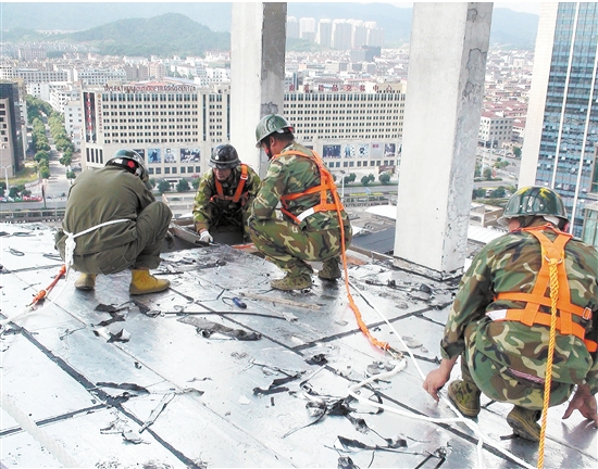 拆除工作异常艰难,房子南侧与西侧是悬空的,人往下看就会有眩晕的感觉。上午9时20分,第一组工作人员在整幢楼房的下面拉好警戒线,危险区域内禁止人员进入。第二组工作人员绑好安全带,系好安全绳,把绳子固定在水泥柱上,然后爬到违法建筑的楼顶,小心地用墙纸刀割开防水膜,再慢慢划开玻璃板连接处的玻璃胶,将玻璃板一块一块慢慢卸下。作业3个小时后,终于在当天下午,将顶楼违法建筑拆除完毕。