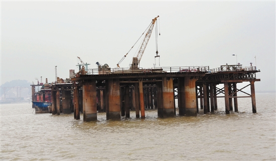连日来,在乐清湾2号桥桥面上,建设者在紧张地施工。乐清湾2号桥长3.23公里,工程总造价约15.29亿元,大桥建设工期为36个月。工程从2014年10月开工,预计2017年9月完工。目前,2号桥已完成工程量30%。