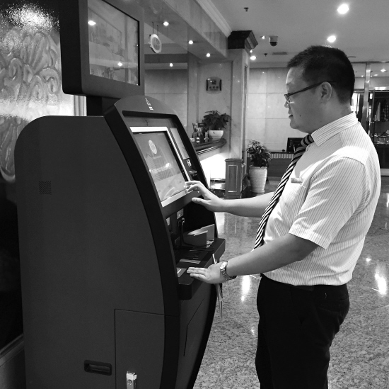 近日,金华市区国贸景澜大饭店引进一台兼具“互联网+”概念的前台自助系统,住店客人在到店之前即可在手机端完成身份证号码录入、选房和支付,到店后只需在智能前台上完成身份证扫描和签名,即可取房卡,整个过程不超过10秒钟。这套系统大大节省了客人入住和退房的办理时间及高峰期排队等候时间,同时,客人还可以享受智能前台提供的各项增值服务。该套系统在市区星级饭店中首创了智能便捷、人机互动的新时代。