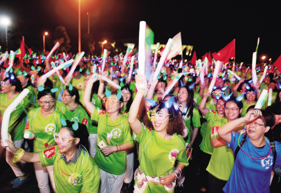 昨晚7时不到,在市体育中心的广场上,人声鼎沸,热闹非凡。参加“绿色出行,美丽金华”2015世界“无车日”金华首届大型公益荧光夜走活动的800多人,随着主持人一声令下,向终点市民广场进发。