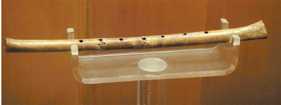 本次展出的还有一件新石器时代贾湖遗址发现的骨笛,距今约8000年前,此笛是以鹤类尺骨锯去两端关节、钻孔而成,从骨管上所留的等分刻符可知,在钻孔前经过了认真的计算。经测试,它能吹奏出七声齐备的下徵调音阶。这说明早在茹毛饮血的原始时期,我们的先民就已经能够利用自然界的动物制作乐器,演奏和欣赏优美动听的管吹音乐了。