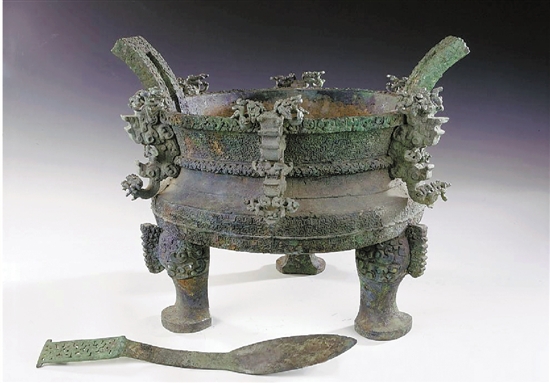 同样形状而大小相次的鼎,在王子午的墓葬中共出土了七件。根据鼎内刻着的鸟篆体铭文,说明这种形状的鼎是升鼎,即将镬鼎中煮好的牲肉取出放入此鼎来调和保温。