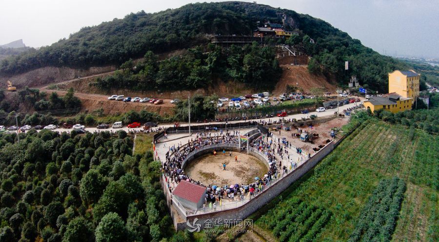 随着一声号响,昨天上午,在婺城区雅畈镇徐店村铜山斗牛场里,一场庆中秋的斗牛表演吸引来了不少游客。短短一个上午,就有十对斗牛进行激烈的决斗,让前来观赏的游客大饱眼福。