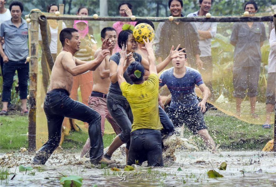 26日上午,在武义履坦镇后桑园村的黑马家庭农场里,一男一女两支足球队在泥塘里踢的激烈,在塘边观战的人群中喝彩声一浪高过一浪。原来,这是武义履坦镇后桑园村两委为了庆祝“干塘节”而举办的草根泥地足球赛,除此之外,报名参加的人还可以观看莲田斗牛赛,体验抓鱼游戏等草根游戏。主办方表示,报名的人很踊跃,不少在城市里呆久了人回归乡野,在土地上“野”一把,让自己工作一星期的身体放松放松。