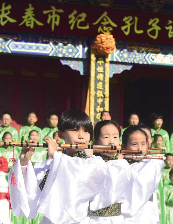 9月28日,孩子们在长春文庙举行的祭孔大典上演奏。