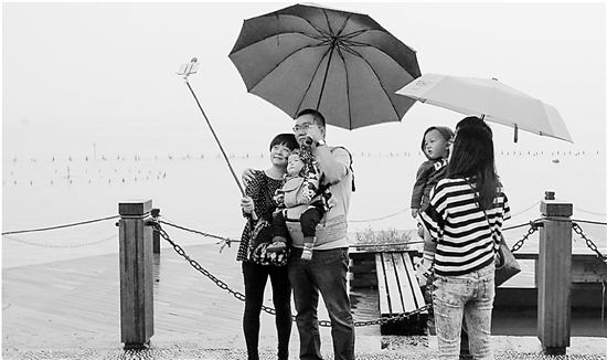 从河南信阳来的小杨带着1岁的女儿和几个朋友,在湖边伫足许久。