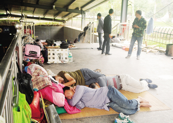市区人民广场地下停车场北门的行人通道内住着10多名流浪汉,不仅影响了通道的通行及环境卫生,而且时有治安案件发生。昨天,记者在此通道看见,打地铺的流浪汉里有9人在呼呼大睡,还有一些在聊天。其中一名流浪汉说,他平时靠捡垃圾为生,因为这个通道地理位置好,地方宽敞,就把这里当成了临时的家。