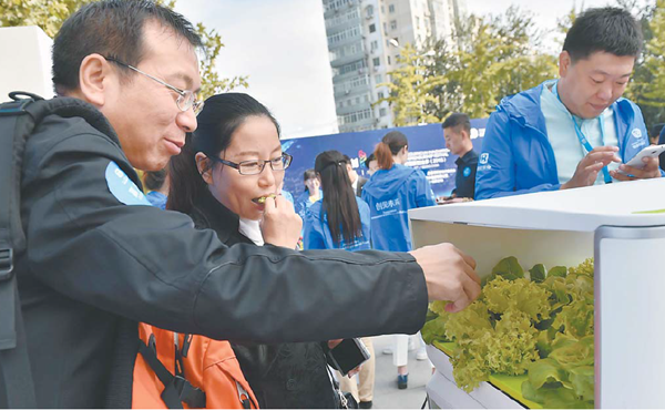 10月11日,在2015北京中关村创新创业季开幕式上,观众品尝用智能果蔬种植机种植的蔬菜。