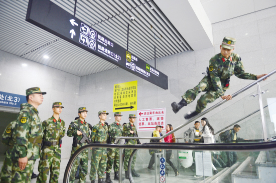 10月10日,武警重庆总队二支队龙头寺巡逻中队在人流密集的重庆北站举行专项电梯事故应急救援演练,提高执勤官兵在应对电动扶梯出现故障及突发事故时候的救援能力。图为巡逻中队班长李杨(右)在演示“自动扶梯卷人事故”应急救援技巧。