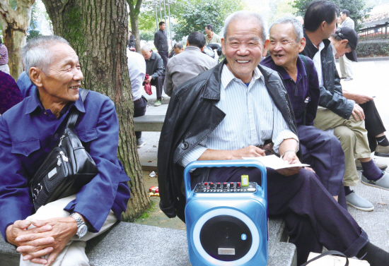 昨天,市区人民广场上颇为热闹,有看戏的,有聊天的,也有坐在石凳上玩牌的。78岁的贡金元自带一个扩音器正在听婺剧,吸引了众多市民。贡大爷说,他早上坐公交车来到广场,还自带了中饭和水,一般下午4点回家。广场上人多,大家在一起听戏很过瘾。