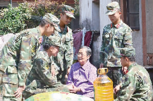 10月17日是我国第二个扶贫日,昨天下午,武警金华支队官兵来到婺城区新狮街道方井头村,给该村82岁独居老人何秋蝉送去了米和食油。何秋蝉老人腿脚不方便,武警官兵表示今后要定期前来看望。