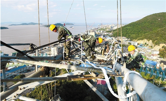 10月18日,电力工人在舟山市岱山220千伏输电线路改造工程k1号塔上进行下相导线拆除施工准备。当天,岱山220千伏输电线路迁建高亭大跨越段开始施工。