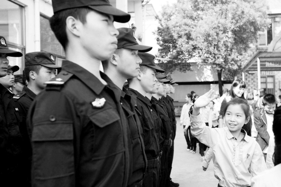 活动中,孩子们排成整齐的两队,在警官、老师的带领下参观警营。