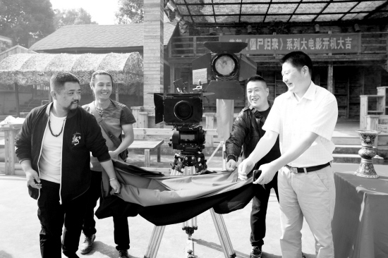 10月16日,《僵尸归来》系列电影之二、三在永康市江南街道江南渔村举行开机仪式。这部影片将在永康取景拍摄20多天。目前,该系列电影的第一部已在各大网站播出,“爱奇艺”上的点击率已过千万大关。“永康人非常好客,我就选择到永康来了。这里有山洞、竹林、小桥等,景观非常符合电影的风格。”导演秦教授说,剧组将奔赴永康石鼓寮、十里葡萄长廊等地取景拍摄。