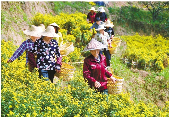 10月25日,在松阳县象溪镇上梅村,村民们在采摘高山黄菊。今年,该村利用高海拔优势,引进黄菊,不仅盘活了村里200余亩闲置的梯田,而且使村民们增收创富。