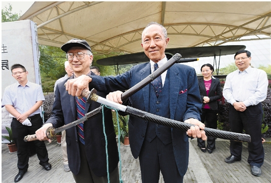 10月25日,南京抗日航空烈士纪念馆获赠1945年日本投降时驻台湾日军将领献降的两把军刀,并在馆内公开展示。这两把献降刀是日本战国时期武士刀中的名刀,由当年中国战区台湾省受降工作及受降典礼参与者林文奎的儿子林中斌、林中明捐赠给南京抗日航空烈士纪念馆。图为林中斌(前右)、林中明展示他们捐赠的日军献降刀。