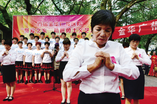 昨天下午,市区人民广场休闲角欢声笑语,金华广福医院“聚爱之家”的30多名抗癌勇士们用歌声、舞蹈秀出健康,感恩生活。