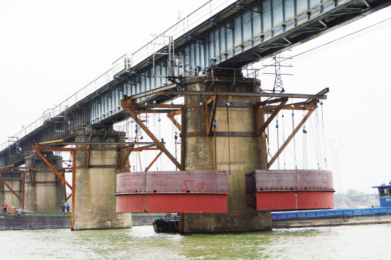 昨天上午,兰溪市兰江铁路大桥三处桥墩处焊花闪闪,维修工人正在进行除险加固攻坚战。据了解,建于1958年的兰江铁路大桥营运已有57年,其间历经多次兰江洪水冲刷,目前江中的7座桥墩基础下方已经部分被冲空,存在安全隐患。此次铁路大桥桥墩除险加固工程于今年9月初启动,预计年底前全部完成。