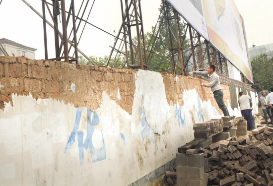 市区二七新村区块改造工程正如火如荼进行。昨天,施工单位对拆迁区块四周砌围墙,实行全封闭管理,防止给周边居民带来烟尘及噪音困扰。施工人员说,拆迁建设工期长,为使这些围墙不再“碍眼”,他们还将借鉴其他城市的做法,在围墙上画些弘扬传统文化的公益广告。