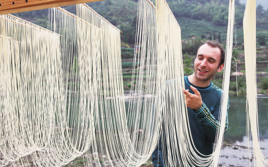 “浦江潘周家一根面上了CCTV、上了中国梦想秀,我都看到了。”这是在杭州工作的奥地利小伙多米尼克到浦江说的第一句话。他说,浦江的一根面非常神奇,细细的一根面能牵动数百人,一定要亲自感受一下一根面的魅力。日前,他和来自美国的公司老板一起到潘周家感受一根面的制作过程,让面店老板周金华手把手教他们拉面,体验浦江农村的风土人情。老外兴奋地展示自己亲手拉出来的一根面,脸上洋溢出成功的喜悦。