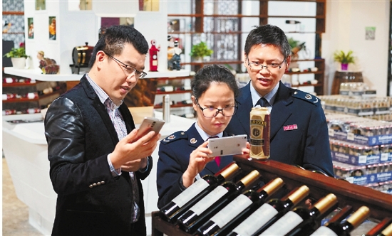近日,绍兴市国税局干部来到浙江冠友集团旗下的电子商务智慧园,实地体验“线下实物体验,线上下单购买”这一“O2O”全新商业模式,并向企业讲解互联网电商最新的税收政策。图为在园区体验扫码线上下单的场景。