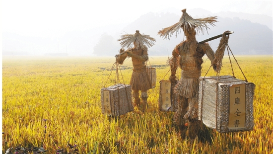 金黄的麦田里,蜿蜒的田埂边,12个稻草人模仿着十二生肖的形状,高高耸立于路边,连表情都那么惟妙惟肖。这些稻草人约莫8米多高,每一个从设计到制作都要花上10天左右的时间,而它们的创作者就是50岁的渔山乡人何新来。