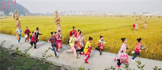 前来参加稻香节的孩子们,在田埂上快乐地奔跑