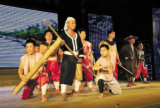 《大山号子》这个节目,是桃溪镇老一辈山民上山伐木的情景模拟,分为伐木、送饭、躲雨、放排4个场景,电闪雷鸣的舞台效果中,村民大声地唱着“伐木工人真辛苦、连同妻小受惊吓、冒险运木为生存、家庭和睦苦也甜”,歌舞由陶元淮一手设计、编排。