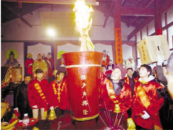 “我一直记得那时的情形,村里正排演《迎大蜡烛》,我作为演员也参与其中。”陶金友口中的“迎大蜡烛”,原本是东垄村从南宋流传至今的民俗活动:每年元宵节前后,村中16岁以上的男丁,从年长者开始往下轮流16个人“作头”,他们将全村自愿捐出的蜡烛熔化,融进一只形似大蜡烛的木桶内浇制成大蜡烛,意寓齐心协力;而后“作头”扛着大蜡烛绕村周游,一路鼓乐开道,家家户户摆设香案在门口迎接。最后占卜预测年成好坏,求“八福”祈愿来年风调雨顺、吉祥丰收。