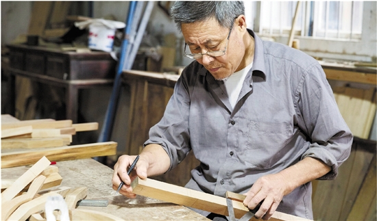 走进沈盛钢的“一根藤”工作室,只见六七位匠人神情专注地端坐在工作台前,或凿孔、或锯圆。这些都是目前天台仅有的几位懂得“一根藤”技艺的匠人,因为沈盛钢的缘故重新在此相遇。眼前这位正在画样的徐存铨老人便是其中一位“非遗”传承人。