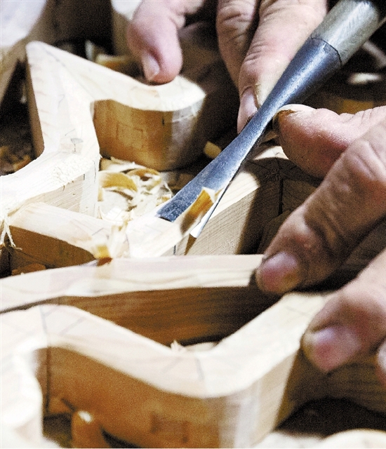 制作“一根藤”,需经过打样、取材、刨条、凿孔、锯榫头、镶图、复样、锯内圆、锯外圆、修交接、修边角、锉光、打磨、兜框等20多种工序,方能完成。其中最难的,是榫头的衔接,弯曲度大的回弯往往需要五六个榫头,匠人不仅需要扎实的基本功,还得有艺术家的素养,能根据宅主的不同要求、房间采光的不同进行独具匠心的设计。