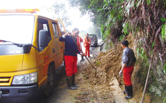 昨天,婺城区公路段苏孟养护站工作人员,忙着清理湖大线山体塌方落到路面上的石块、泥土和堵塞路边边沟的树枝。因连续降雨,苏孟养护站管辖范围内的湖大线、安山线、安下线、汀扬线等多条山区公路出现山体塌方,边沟涵洞出现堵塞。苏孟养护站工作人员在加强道路巡查频率的同时,对道路塌方处、坑洞等进行抢修,以保障公路畅通。