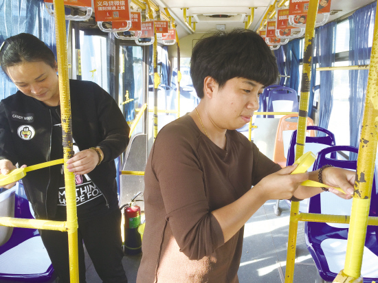 昨天,在市公交集团营运一公司内,工作人员在为20路公交车车厢内的手扶栏杆缠上塑料胶带。据了解,由于进入冬季气温降低,金属杆会变得冰冷,为此司乘人员想出了缠胶带的方法,可以避免乘客的手直接接触到冰冷的金属杆。