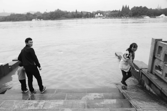 昨天下午,兰溪市区西门码头,一对欲前往兰江中洲公园的父女不得不望江兴叹。由于连续降雨,兰江水位快速上涨,为保障安全,横跨江面的悦济浮桥。据了解,兰江水位中午已达27.50米,目前已经稳定不再上涨。