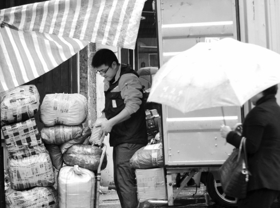 昨天,金华市区文化路一遮雨布下,快递员在整理包裹。据了解,快递员这段时间工作量倍增,然而受雨天影响,派件效率下降。京东快递员黄先生说,他主要配送的商品是家用电器,冰箱、彩电、洗衣机等大件物品。下雨天派送工作不会停止,但是由于下雨道路湿滑,派送时效会打折扣,为了保障快递员和快递包裹的安全,配送时效将会延迟一些,希望市民予以理解。