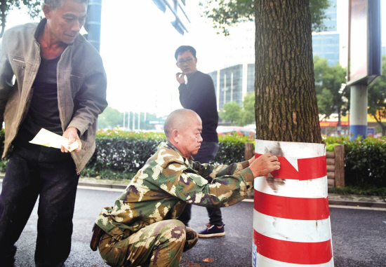 昨天,金华开发区相关部门工作人员给市区双龙南街多棵法国梧桐树穿上红白相间、夜间反光的条形“防撞衣”。安装“防撞衣”可提醒驾驶员和行人提前避让,这既保护了过往车辆和行人的安全,又保护了大树自身。