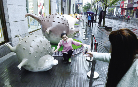 昨天,金华市区西市街上的“鳄鱼”、“豹”等动物吸引了许多路人驻足合影,瞬间让合影者变得萌萌哒。市民小刘说,她家就住在附近,回家时喜欢从西市街走。这一带经常会有商家的企划创意亮相,这让她觉得回家途中不那么单调。